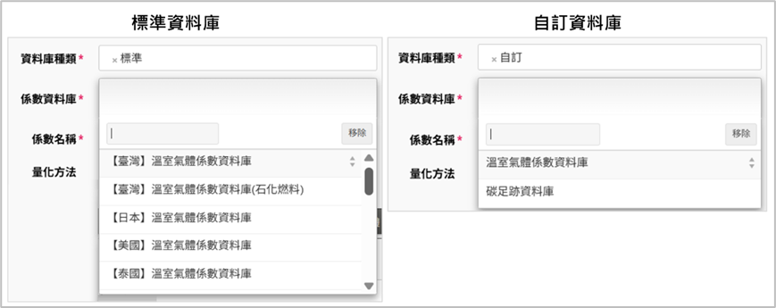 - 標準 : 若在【資料庫種類】選擇「標準」,則【係數資料庫】選單會顯示政府、官方機構發布之排放係數資料庫