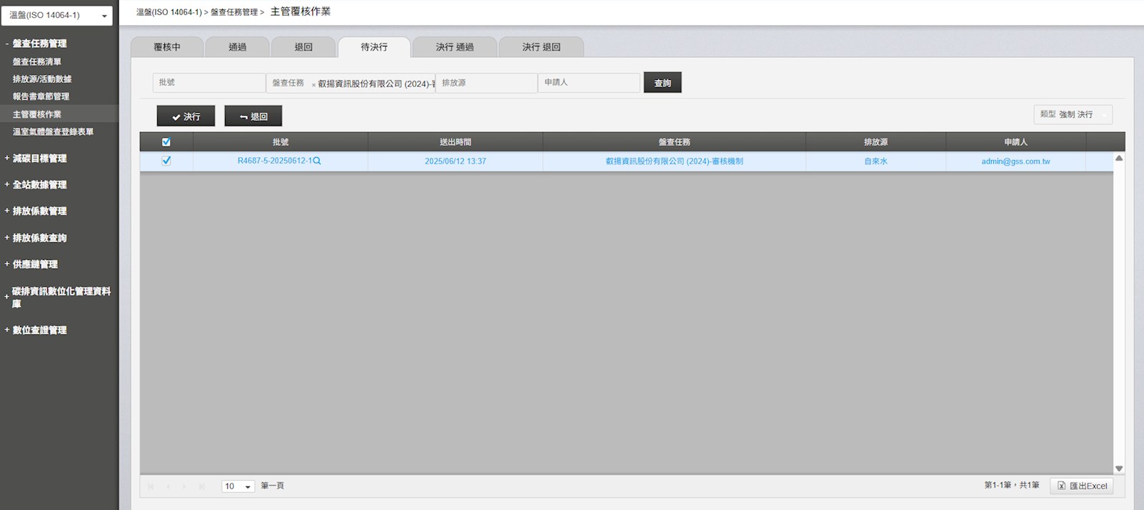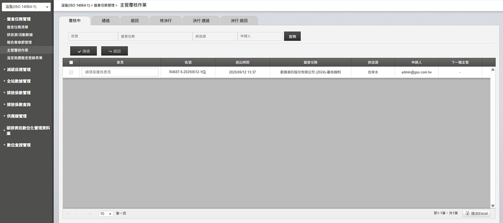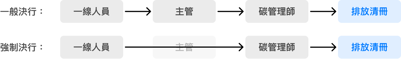- 一般決行:數據審核流程依序為「一線人員」、「主管」、「碳管理師」,最後進入排放清冊