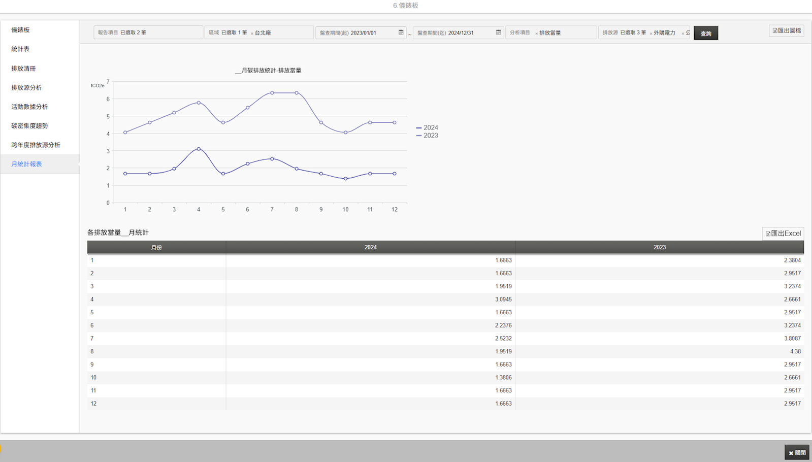 請選擇「月份統計報表」。可以選擇多個區域、多個盤查任務、多個排放源進行分析,圖表有「折線圖」以及「統計表」,如果需要下載圖表或統計表的話,可以點選【匯出圖檔】以及【匯出Excel】。
