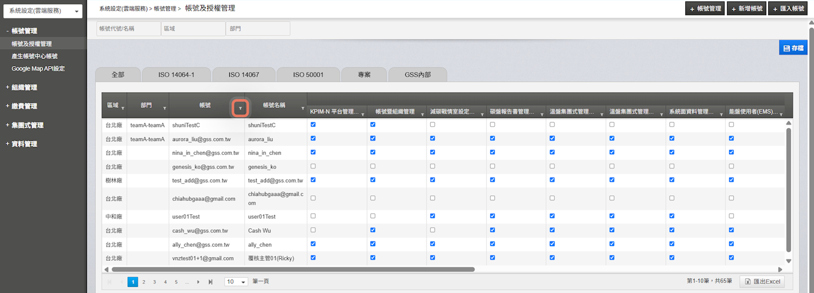 管理者可以同時將多個在系統內的使用者帳號進行權限的設定,並且在系統內根據不同系統模組選擇想要設定的功能權限,選單中選擇【系統設定(雲端服務)】之後,點選【帳號及授權管理】,接著點選【設定權限】,就可以看到權限功能按照系統功能模組分類,管理者只要透過漏斗圖示尋找帳號並勾選要開啟的權限即可完成權限的設定。