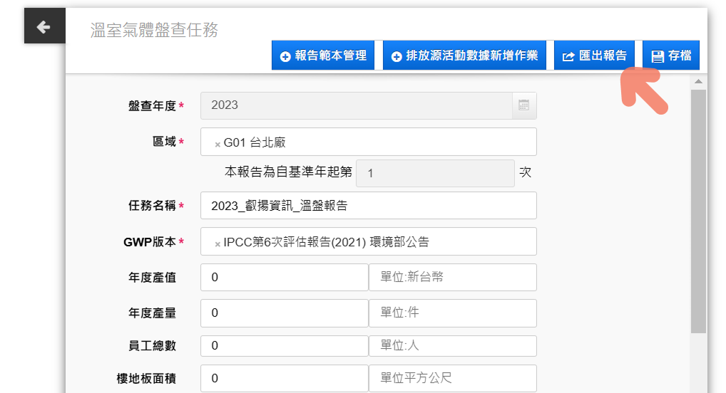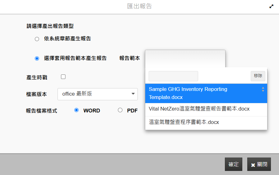 在【盤查任務】開啟「匯出報告」功能,選擇套用報告範本產生報告,選擇報告範本「Sample GHG Inventory Reporting Template.docx」(系統固定提供),即可匯出 GHG Protocol 報告