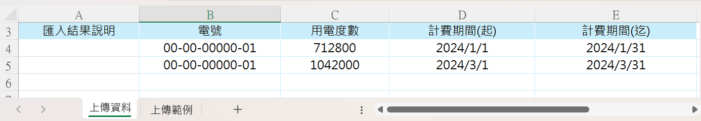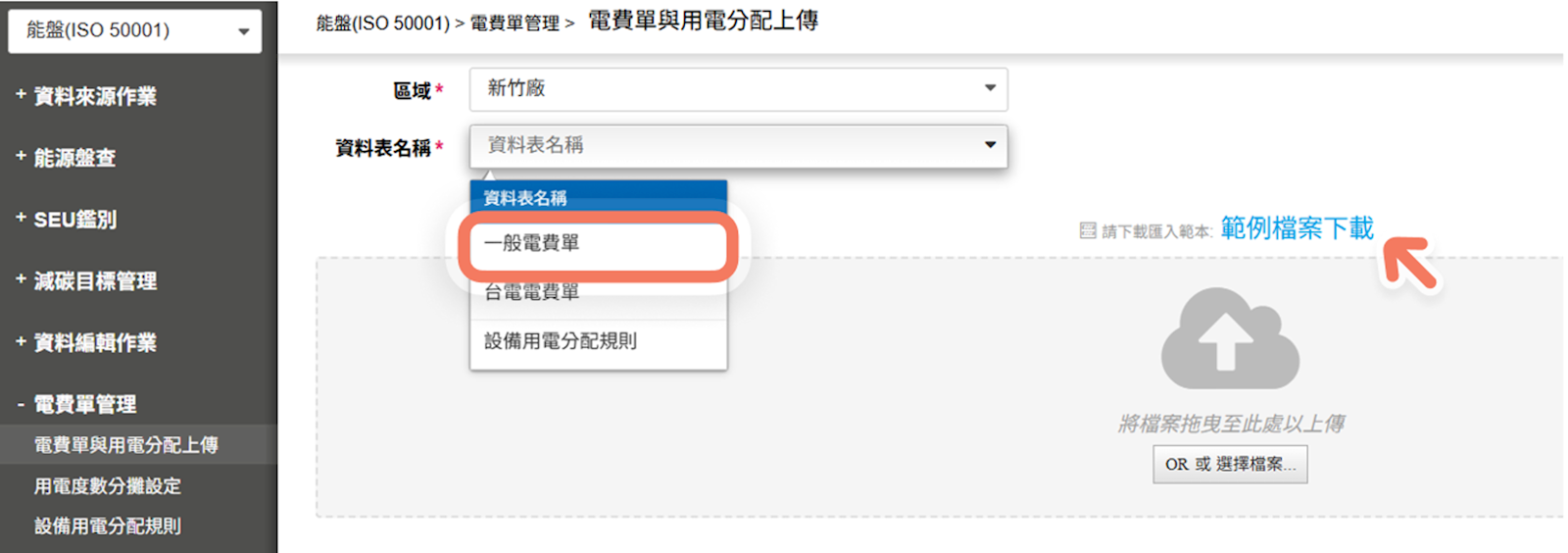 路徑:左側選單【電費單管理】 >【電費單與用電分配上傳】> 選擇 [一般電費單] > 點擊【範例檔案下載】,可下載一般電費單上傳格式。