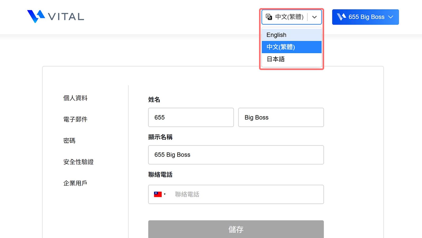 初次進入系統時,介面將自動依據Vital官網或瀏覽器的設定套用語系。若設定的語系目前不在支援範圍內,系統會預設顯示英文。範例說明1:Vital官網的右上方可修改語系,修改成「日本語」或「English」,系統登入則會顯示該語言。