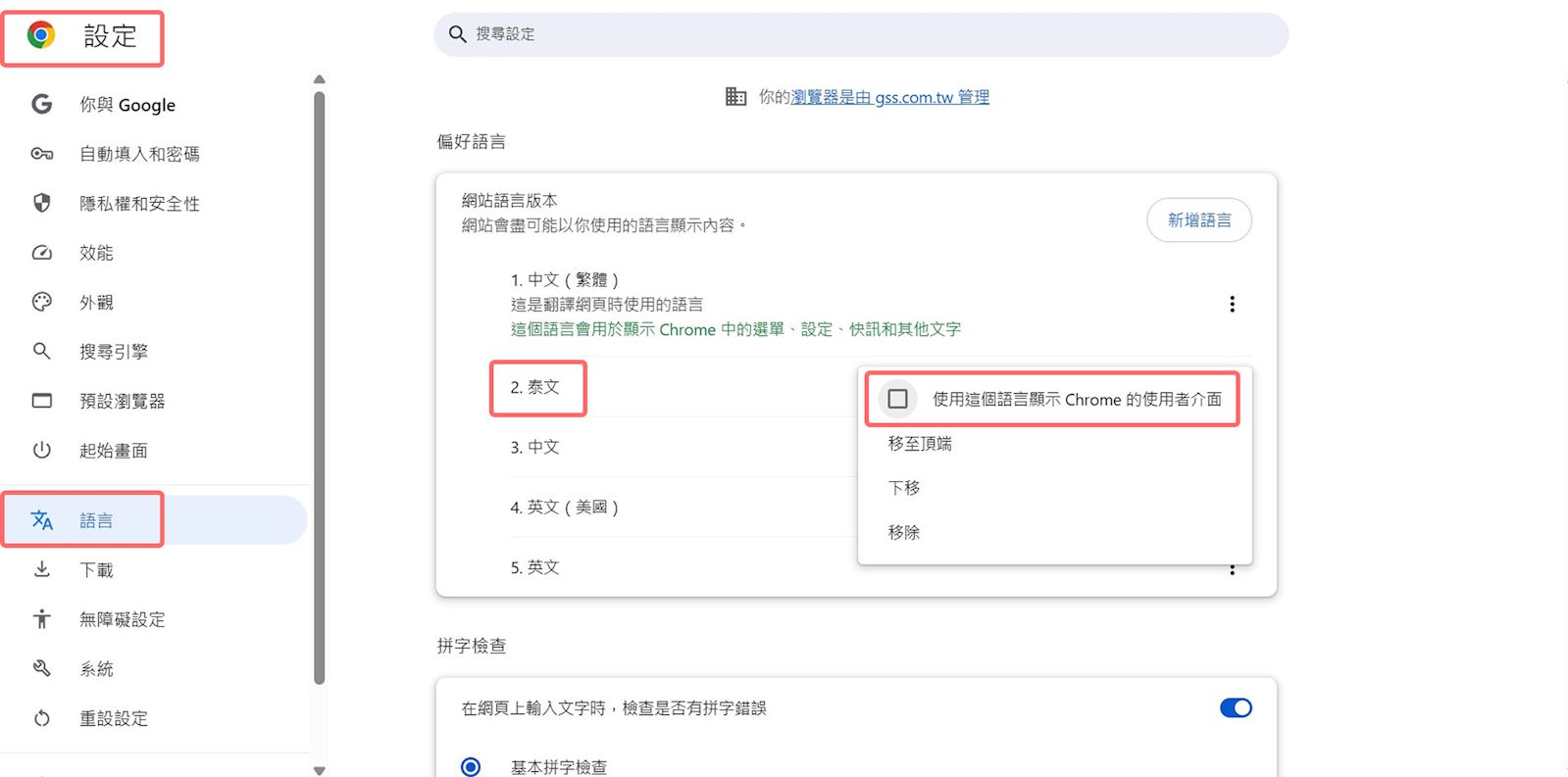 範例說明2:進入瀏覽器【設定>語言>偏好語言】,將語言版本修改成泰文,則登入畫面則會顯示泰文。(使用Chrome作為示範)