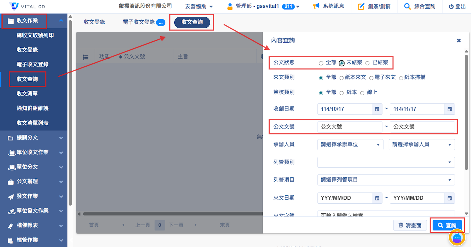 1. 首先,請依照下列步驟進入頁面:【收文作業】>【收文查詢】>【公文狀態:未結案】>【輸入文號】>【查詢】