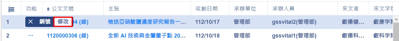 來文分文後無法退回收文人員,需請收文人員至「收文作業>收文查詢>搜尋未結案公文>修改」,調整承辦人員後存檔,重新指派承辦。