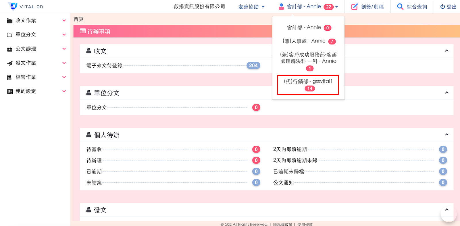 回到系統後,可以在上方切換身份,以代理人的身份代辦公文。當有公文需要辦理時,代理人及原辦理人都會收到公文的相關通知。