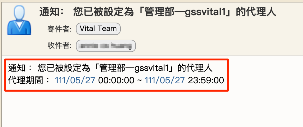 當同事指定你為代理人時,你會收到信件通知,信中會註明你要代理誰的公文、代理的期間。