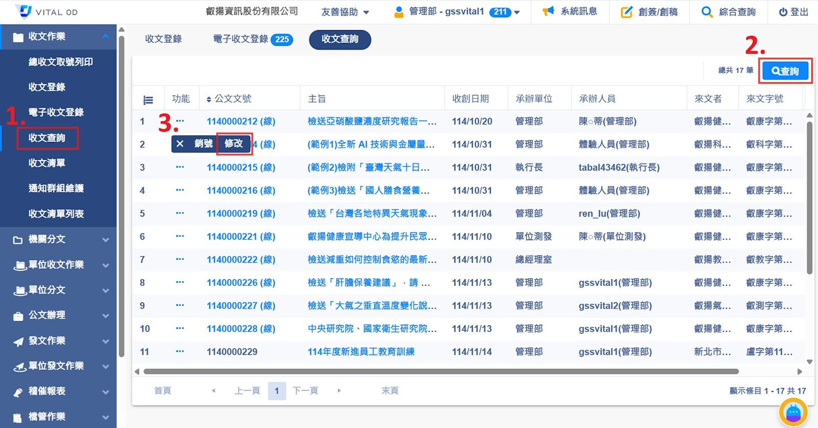 請收文人員於【收文作業>收文查詢】中查到該公文後,在列表前方點開「...>修改」。