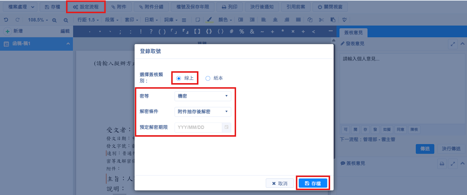 4.填寫完公文資訊後,點選【設定流程】,「簽核類別」選擇「線上」,選擇密等及解密條件後,點選「存檔」。