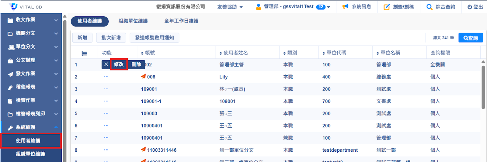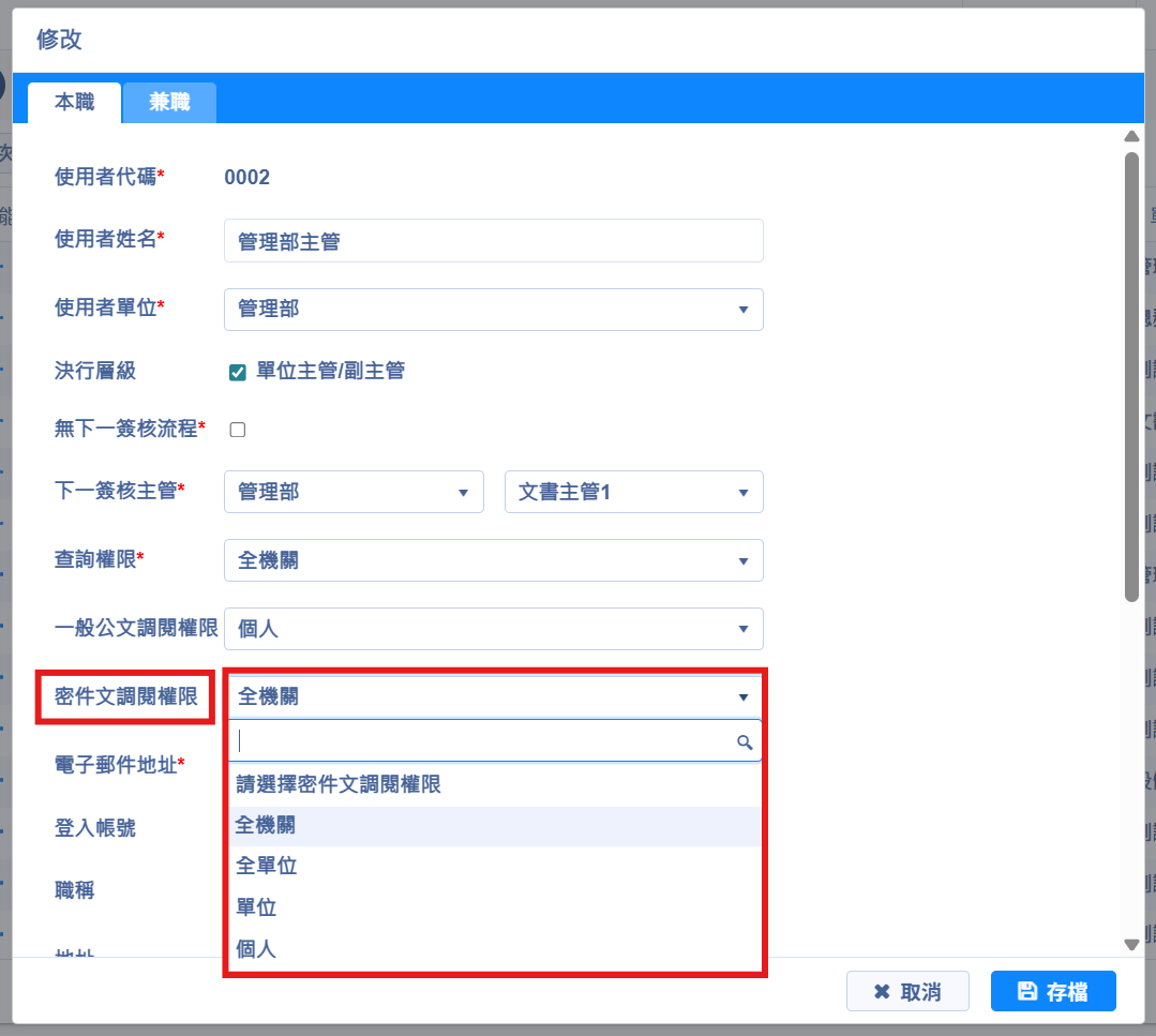 1.點選【使用者維護】>【修改】,即可設定密件文調閱權限。
