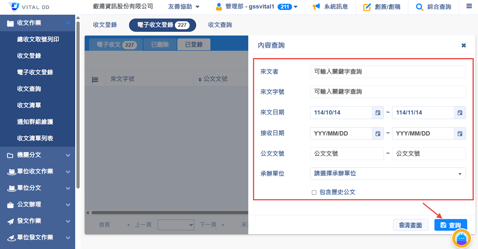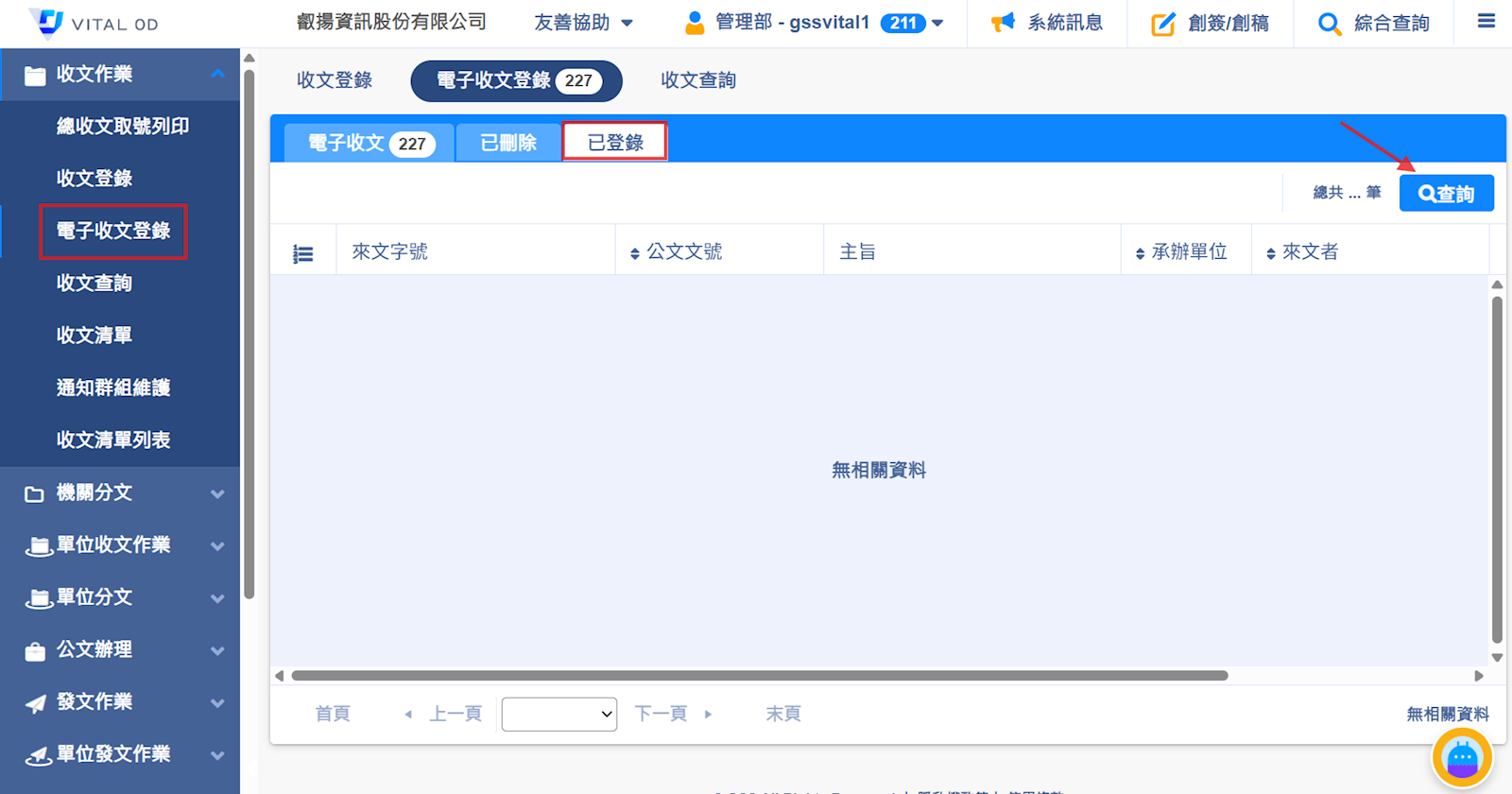 您可以於【收文作業>電子收文登錄】中點擊「已登錄」頁籤,並利用右上方的「查詢」按鈕,依條件篩選公文。
