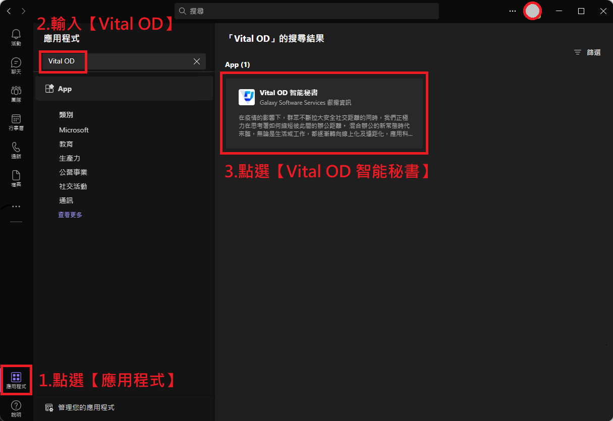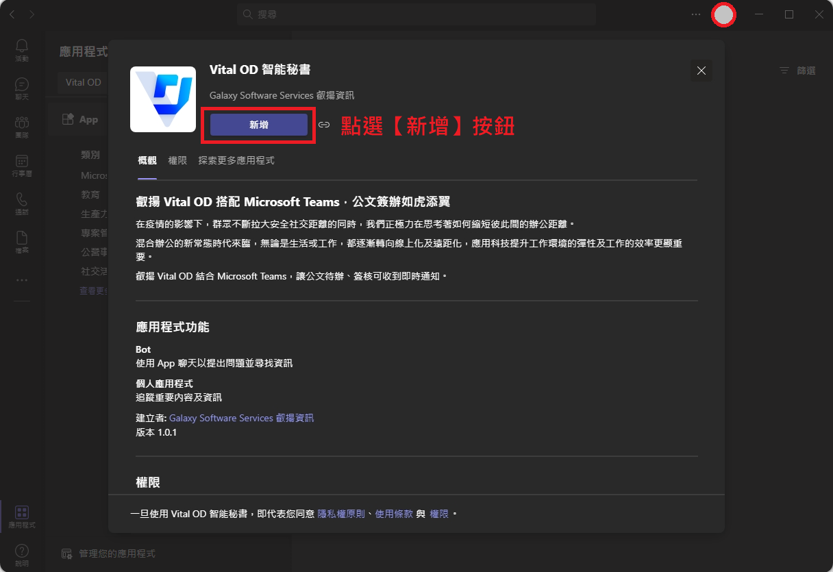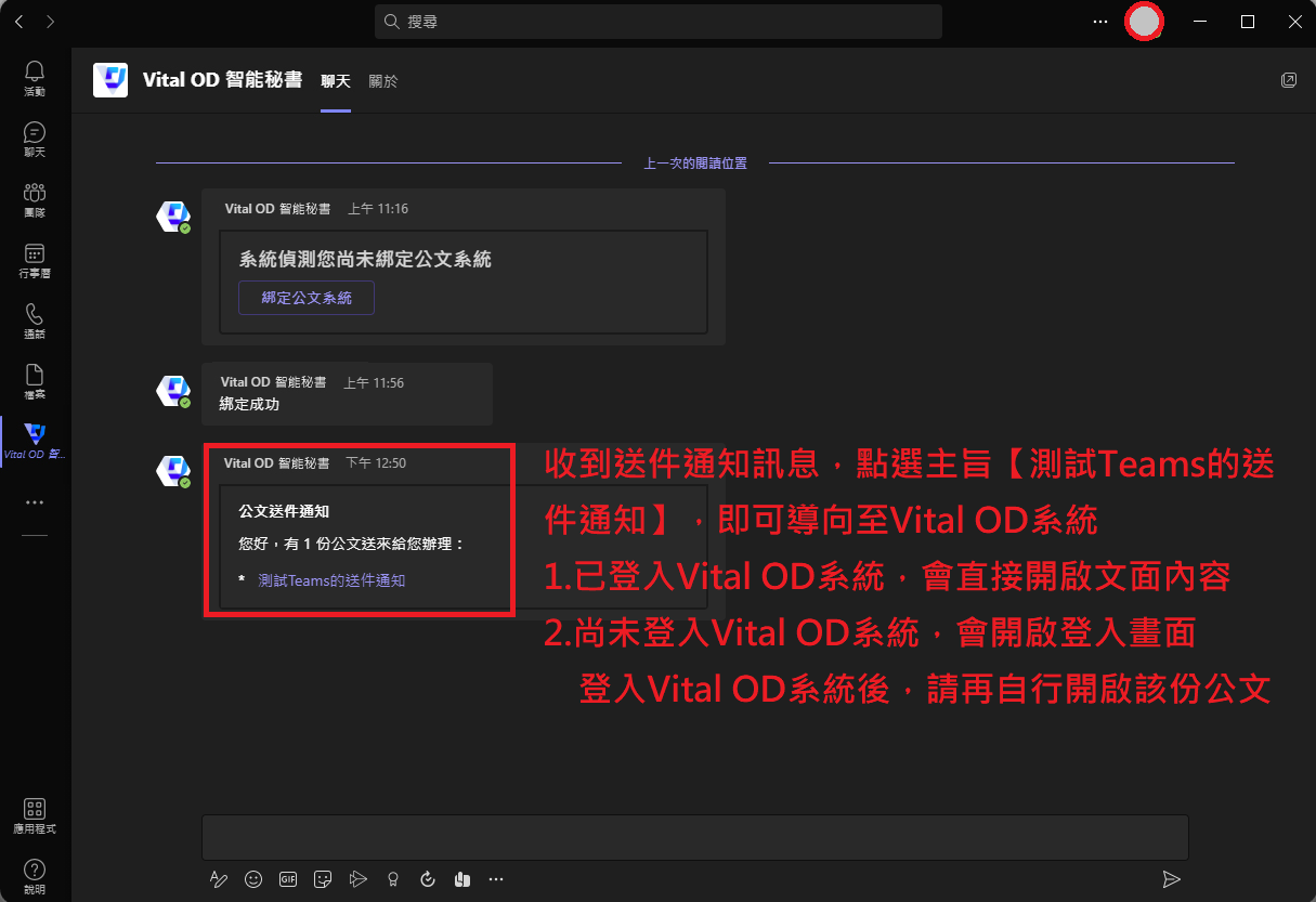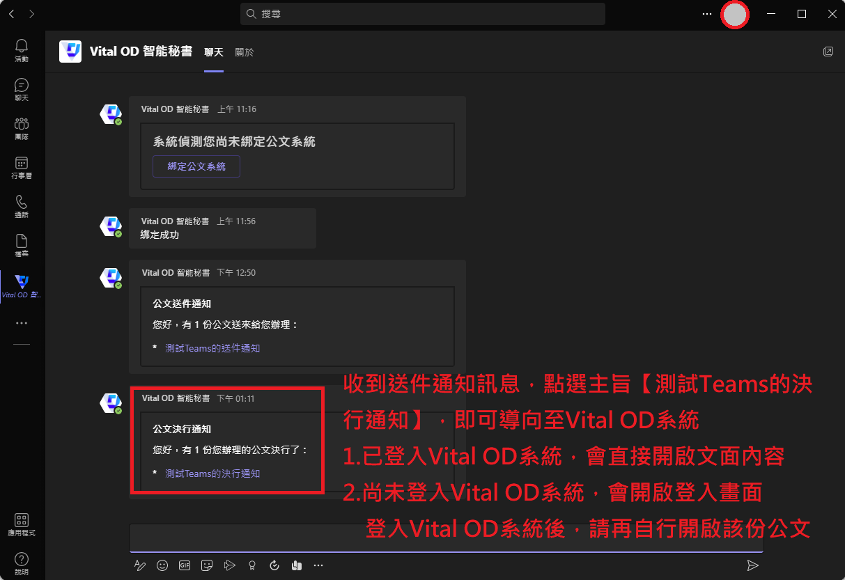 送件通知及決行通知,可透過 Microsoft Teams 接收訊息,操作方式如下: