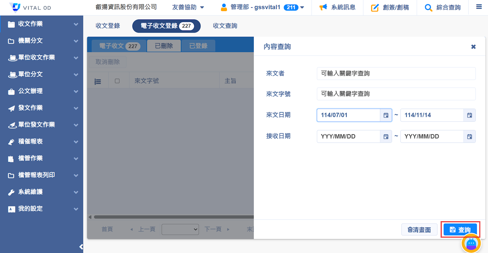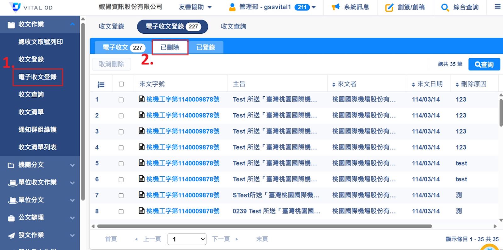 請先到 收文作業 >>電子收文收入 >>已刪除