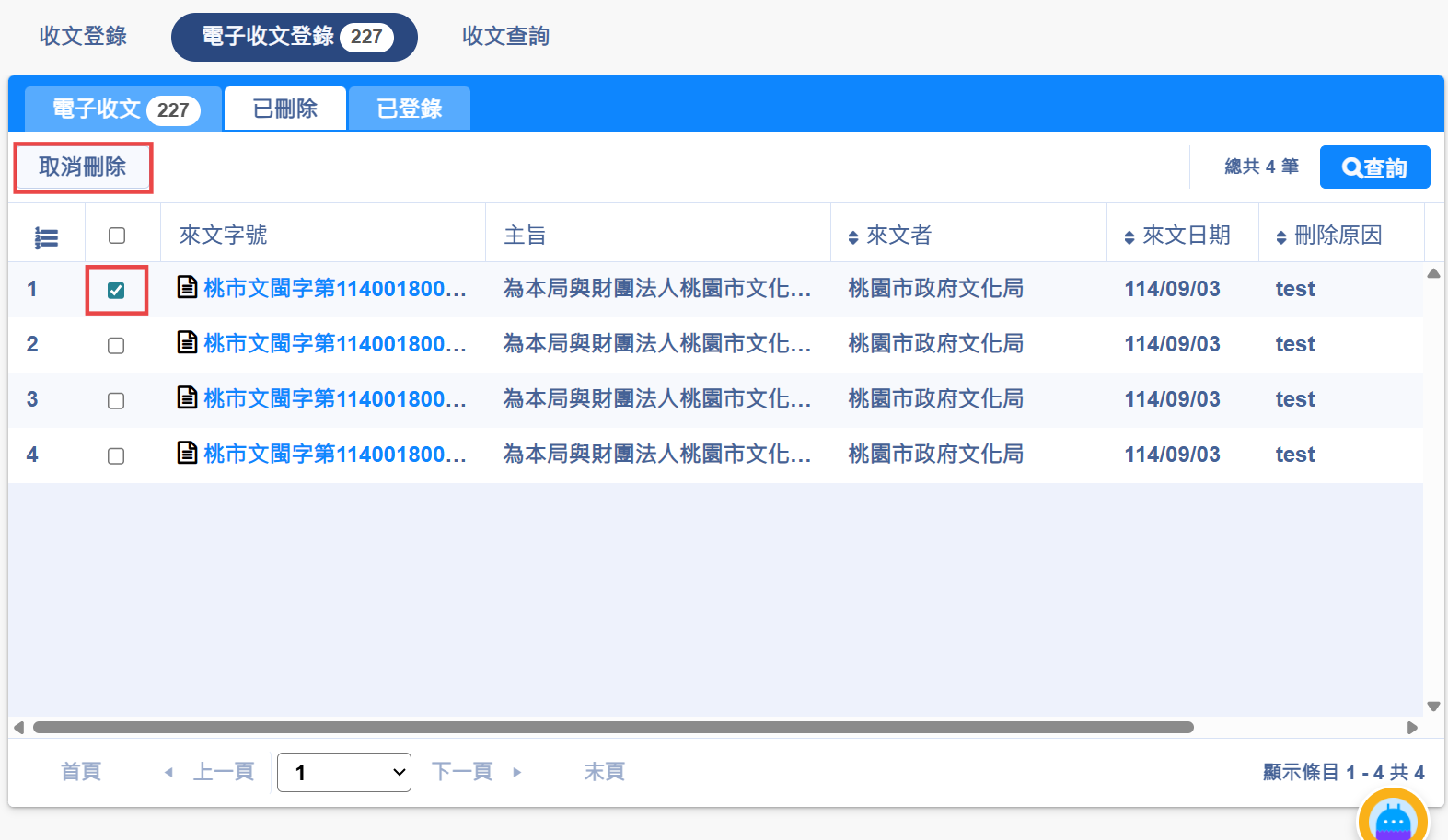 最後選取您想刪除的公文,點選取消刪除按鈕就可以恢復已刪除的電子公文了