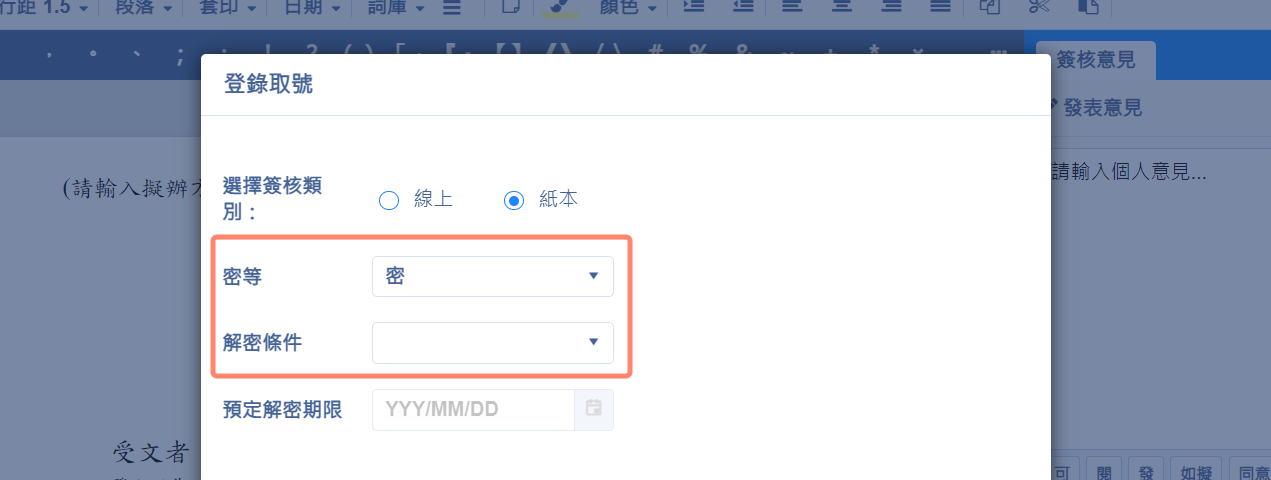 登錄取號的畫面選擇密等但無選擇解密條件的話,存檔時會提醒承辦人要選擇解密原因