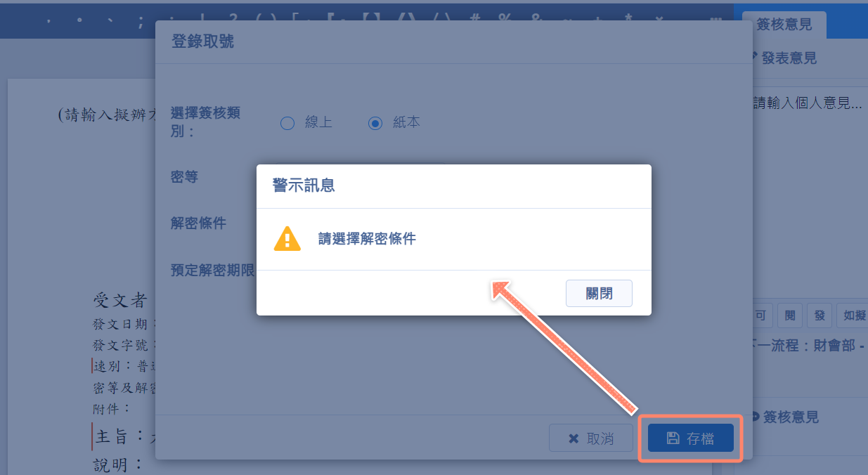 承辦人在登錄取號的視窗選擇「密等」,但沒有選擇「解密條件」,在存檔時會有提示訊息通知承辦人要選擇「解密條件」後才可以存檔