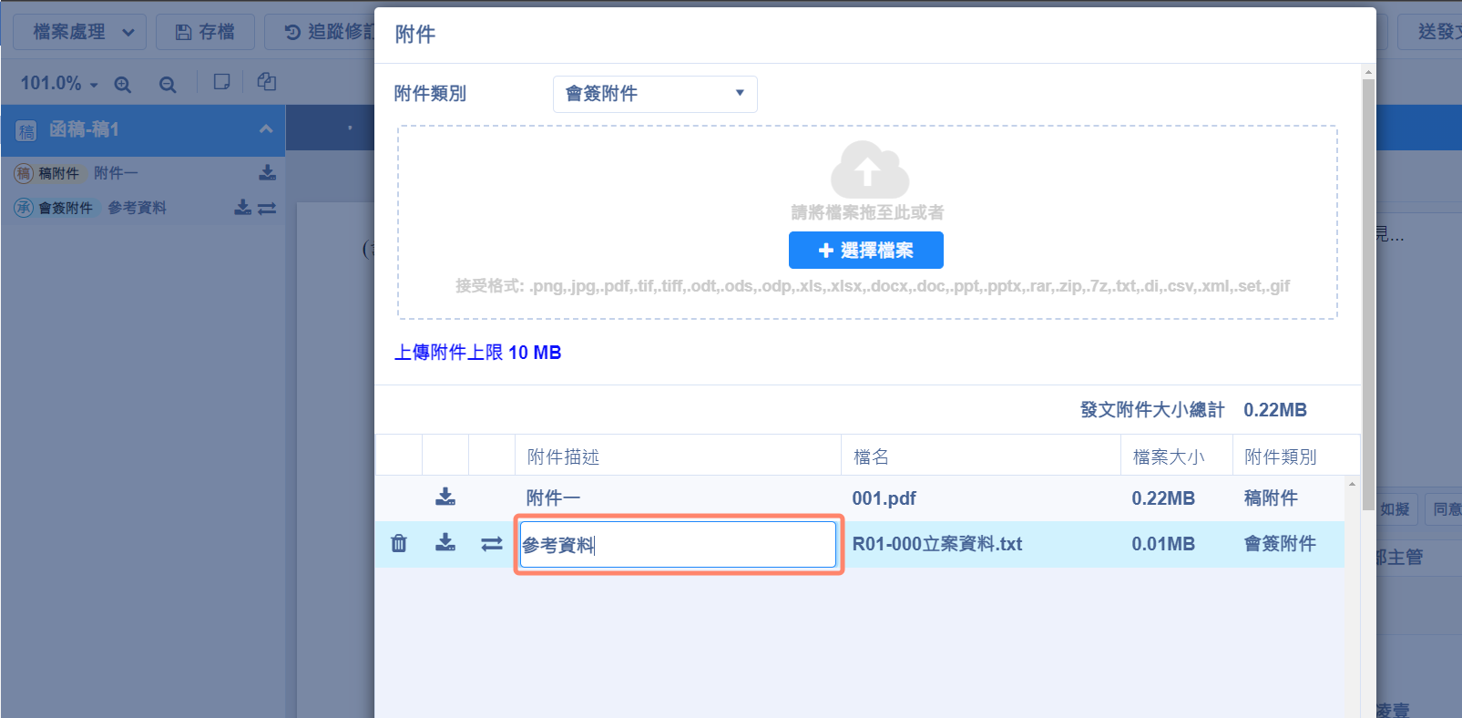 提供決行後公文夾帶的會簽附件,可以修改附件說明。
