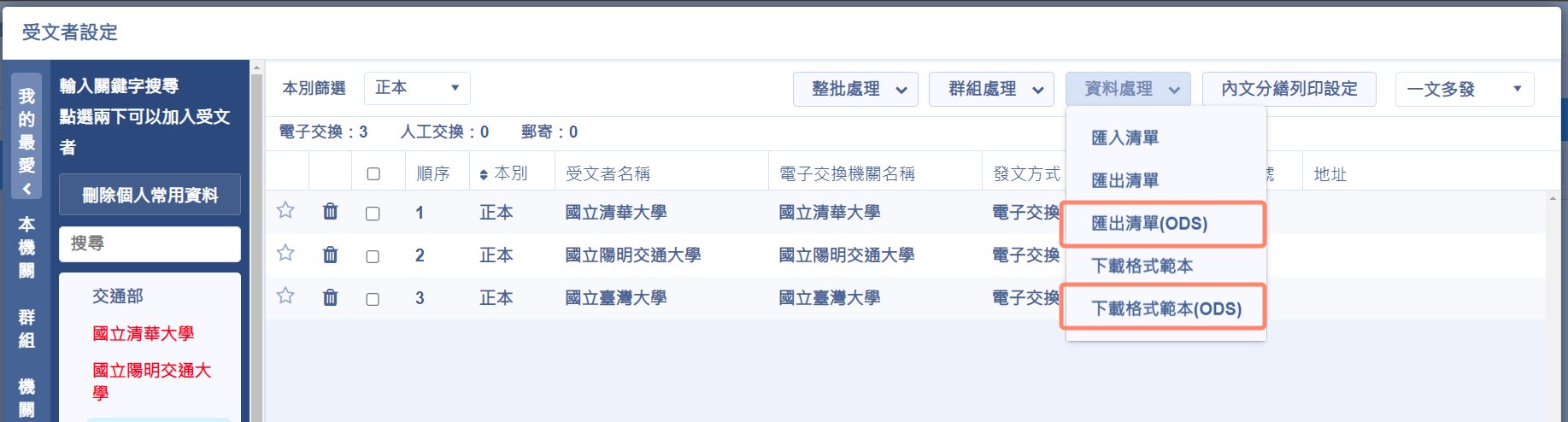 受文者及內文分繕的匯出與匯入,新增ODS格式
