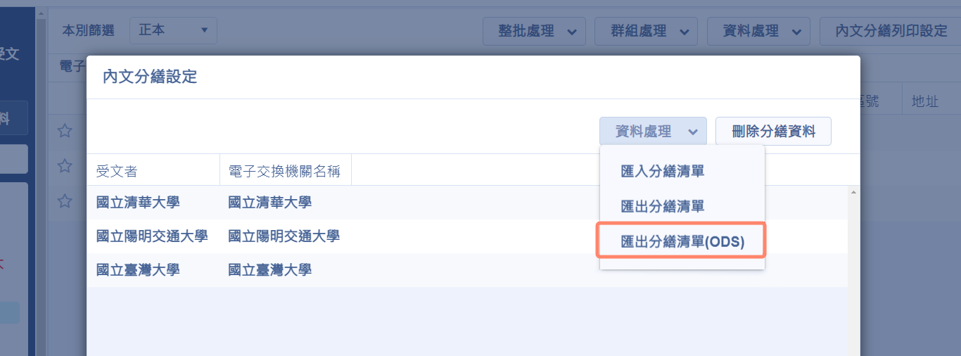 受文者設定提供的「匯出清單」以及「下載格式範本」,還有內文分繕列印設定的「匯出分繕清單」,新增ODS格式提供使用者下載及編輯後匯入。