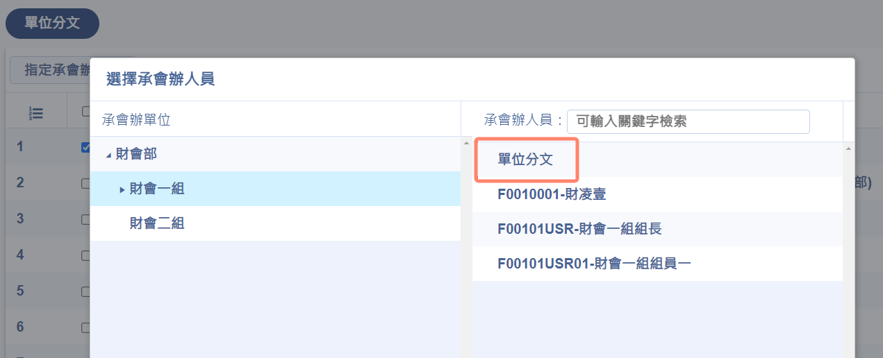 機關分文或單位分文於指定承辦人的畫面,若選擇的單位有單位分文人員,可指定該單位的單位分文