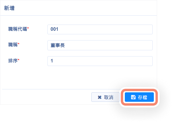增加職稱維護作業,提供設定人員的職稱資訊:新增職稱。