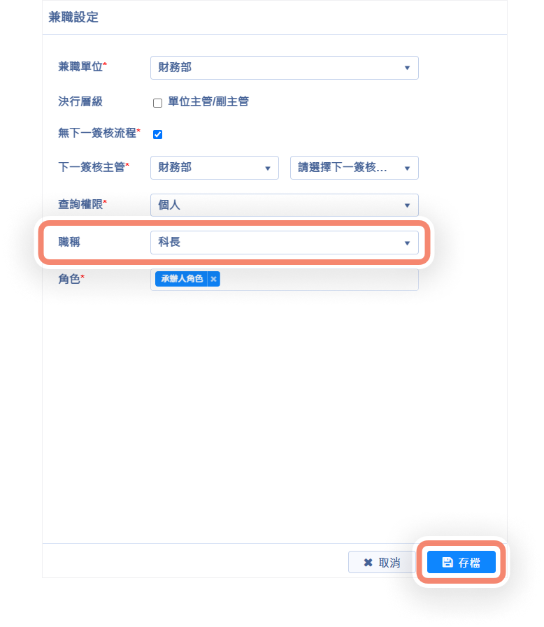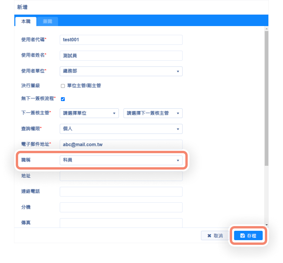 使用者維護:本職及兼職增加設定職稱