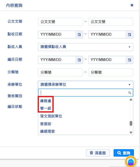 有,查詢條件「承辦單位」,下拉選單有「陳核單位」的選項,如有設定為「陳核單位」的單位,可以在這裡被選到。