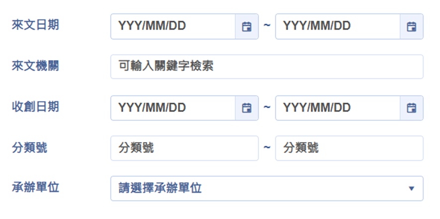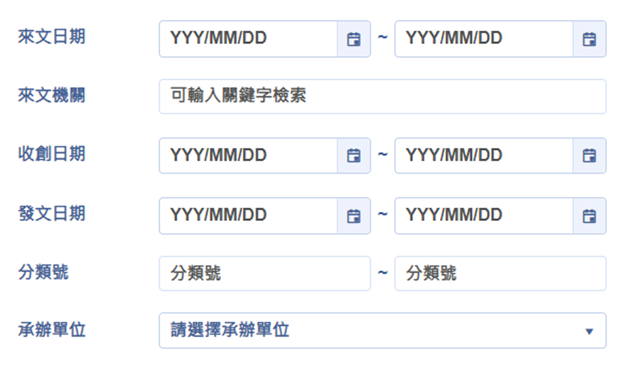 查詢條件部份,「來文日期」、「收創日期」及「發文日期」,需擇一必填
