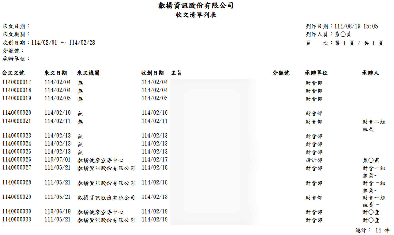 報表提供「公文文號」、「來文日期」、「來文機關」、「收創日期」、「發文日期」、「主旨」、「分類號」、「承辦單位」、「承辦人」的相關資訊來顯示