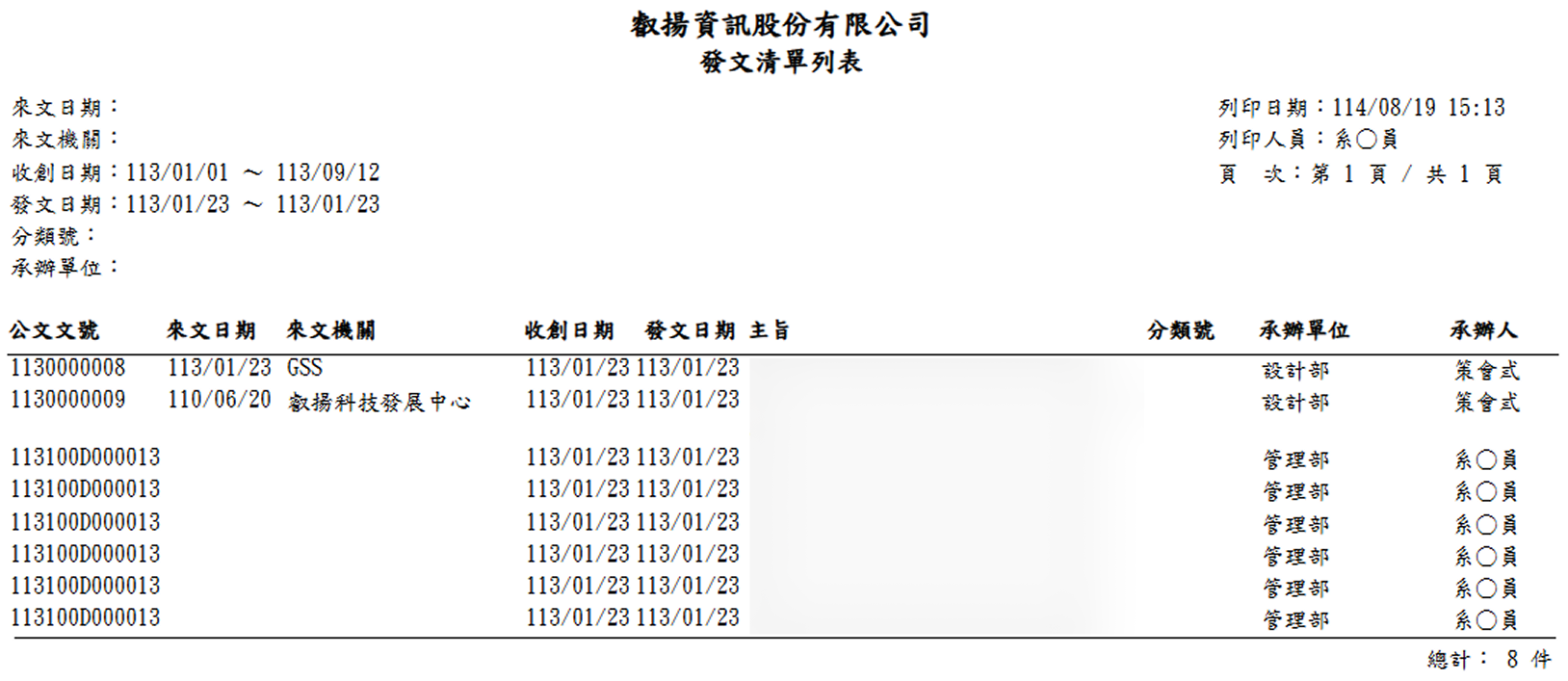 報表提供「公文文號」、「來文日期」、「來文機關」、「收創日期」、「主旨」、「分類號」、「承辦單位」、「承辦人」的相關資訊來顯示