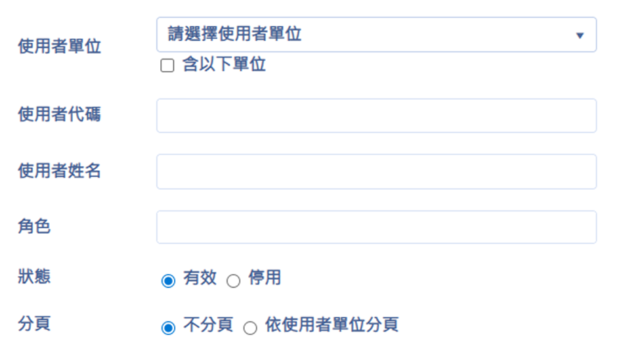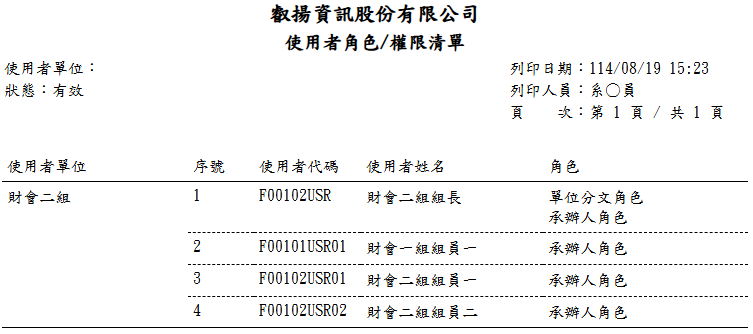報表提供「使用者單位」、「使用者代碼」、「使用者姓名」、「角色」的相關資訊來顯示