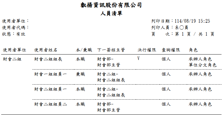 報表提供「使用者單位」、「使用者姓名」、「本/兼職」、「下一簽核主管」、「決行權限」、「查詢權限」、「角色」的相關資訊來顯示