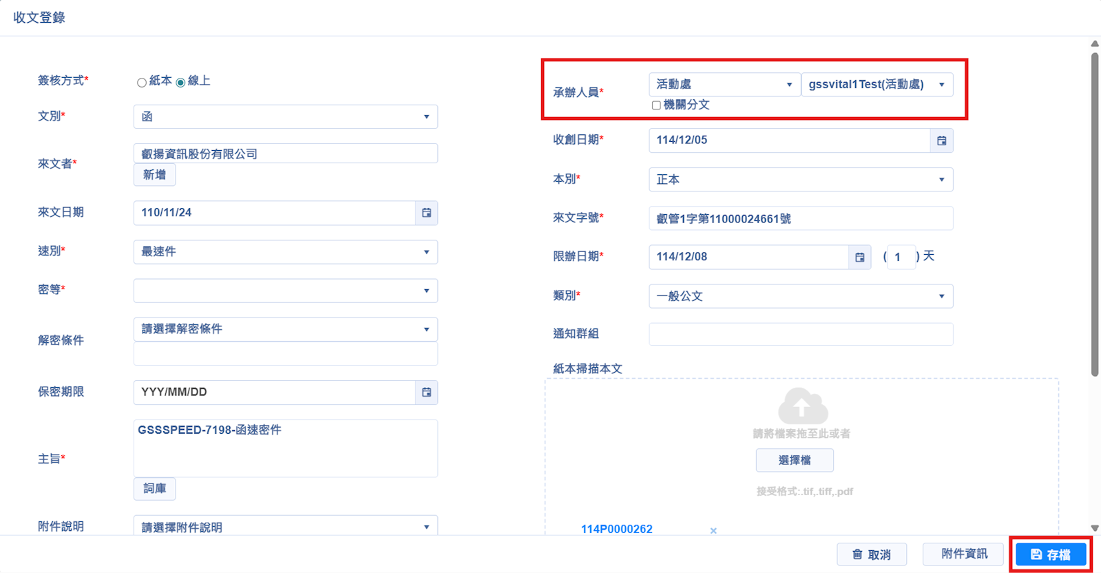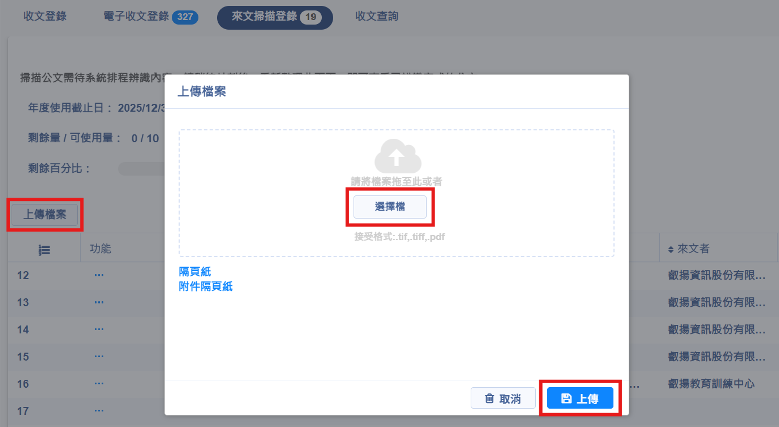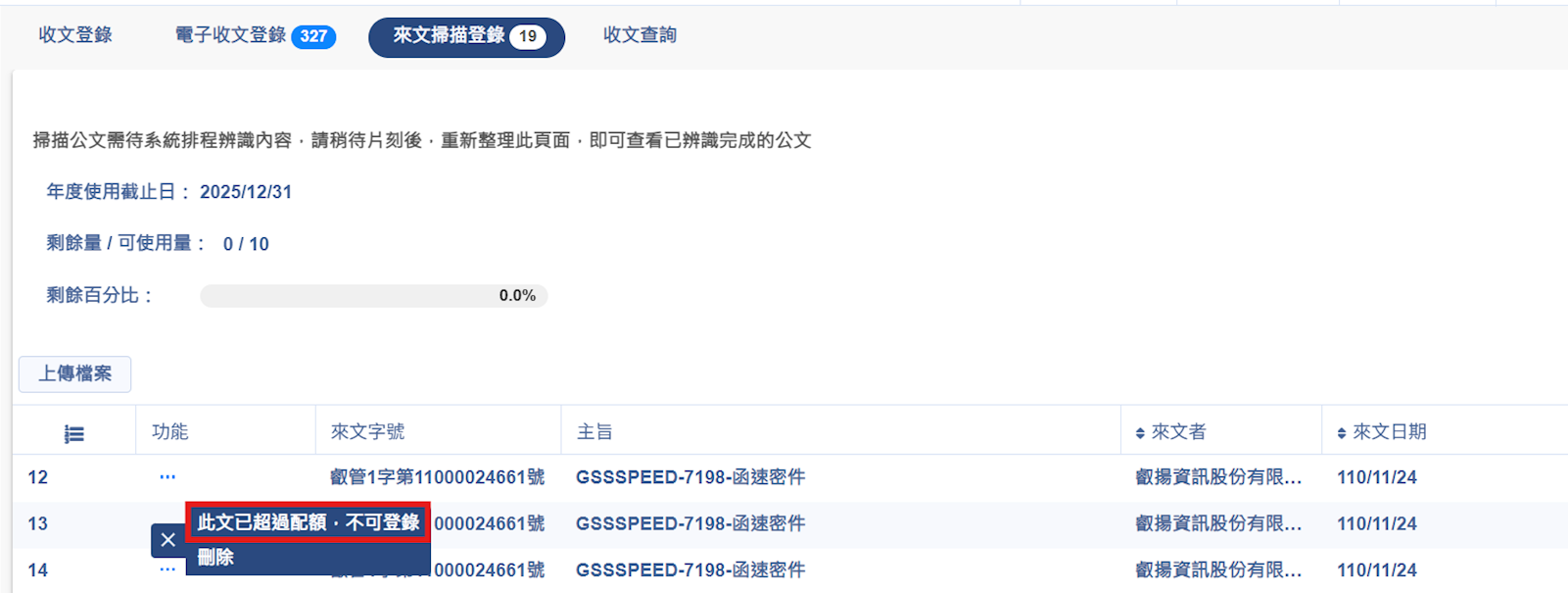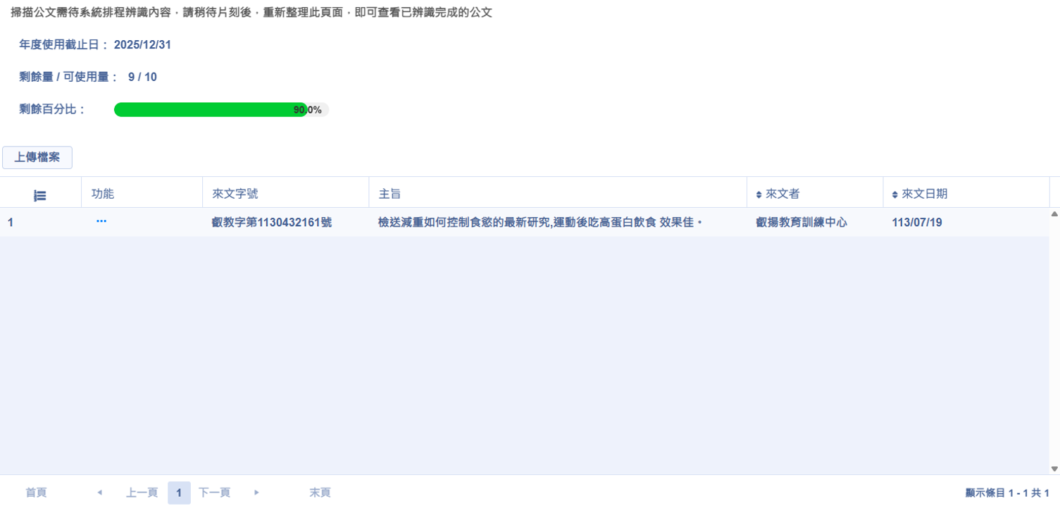 2.系統會進行檔案內容的辨識,重新整理頁面後,在【收文作業】>【來文掃描登錄】可以查看到該筆資料以及年度剩餘量。