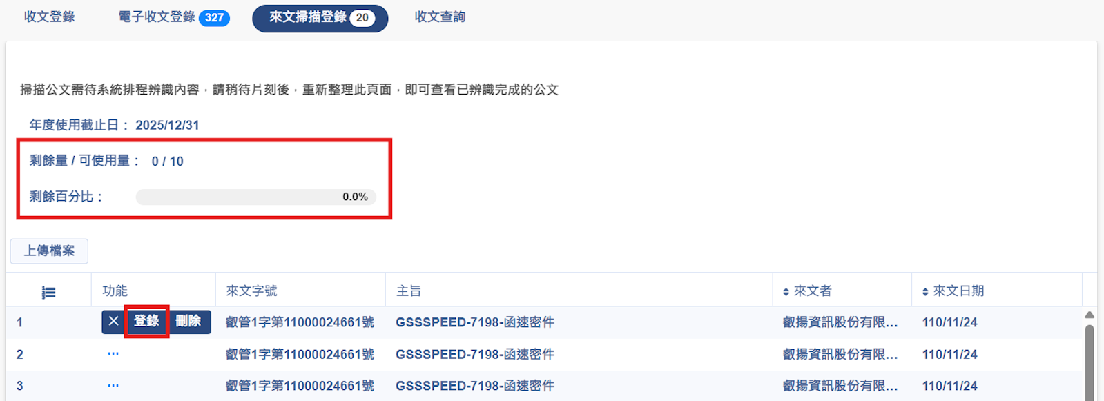 3.系統辨識完成後,在【來文掃描登錄】可以查看到該筆公文資料以及年度剩餘量。