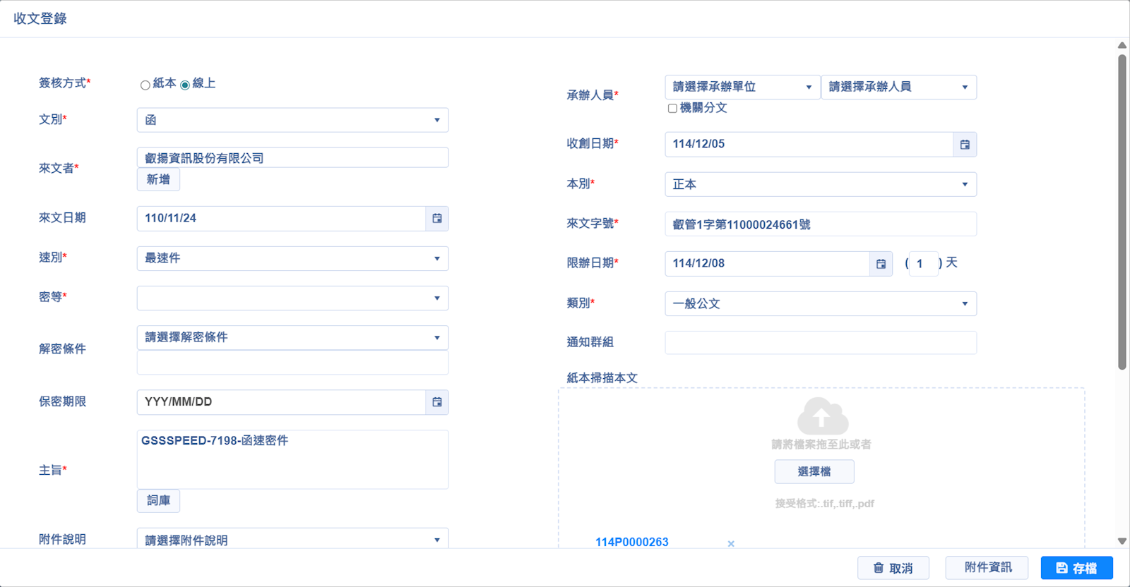 點選功能欄位下的【…】>【登錄】,會顯示收文登錄的頁面。