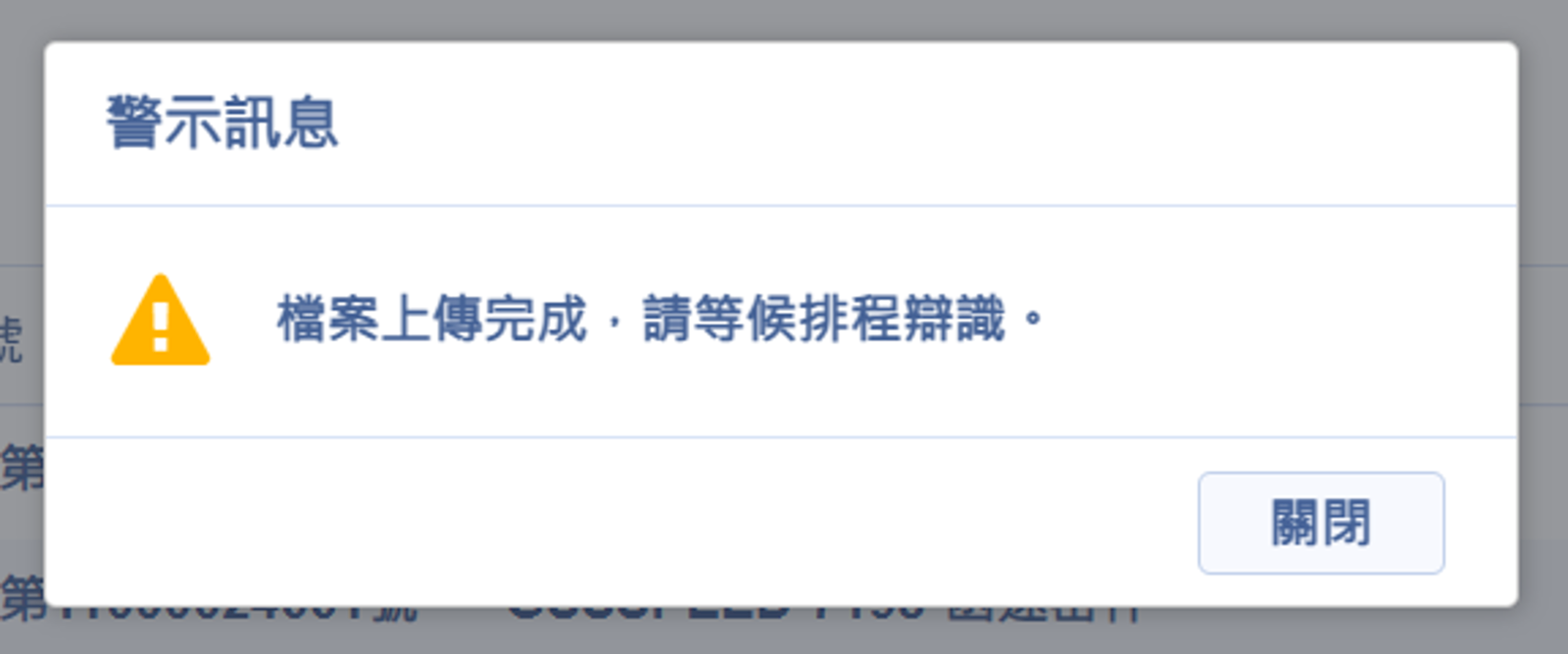 2.上傳完成後,會顯示「檔案上傳完成,請等候排程辨識」的提示訊息。